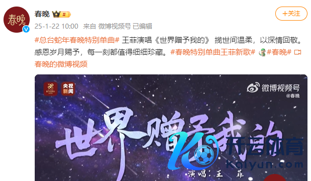 1月22日,@春晚 官方微博发布“蛇年春晚相等单曲”——由王菲演唱的《全国赠予我的》。